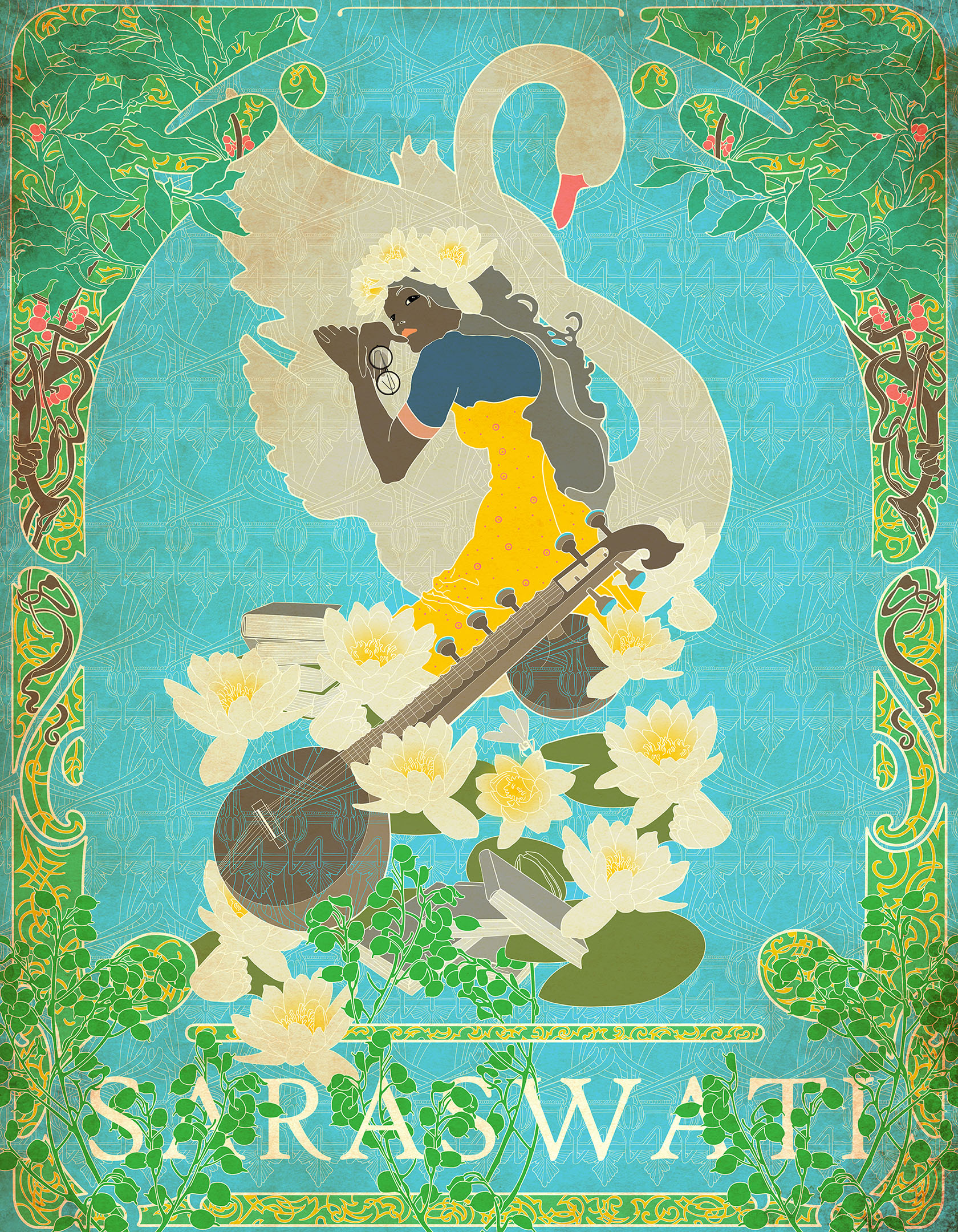 Sara – knowledge, sva – self. Thus knowledge of the self. With an insouciant look, head provocatively tilted, this Saraswati emerges from a sea of Lillies and flirtatiously invites us to drop the gravitas we attach to knowledge and consider it at its most elemental form. Thus unburdened of the serious business of living we can take on the exciting avatars of adventurers, exploring that most exciting of terrains: the self. Freed of preconceived notions. This is a liberating and joyful Saraswati who celebrates life through knowledge. Her engaging youth mirrors that of the person who continues to be entranced by truths that continuously reveal themselves as life unfolds.36”X 27” K3 Pigment Print on Hahnemuhle Etching Archival Paper