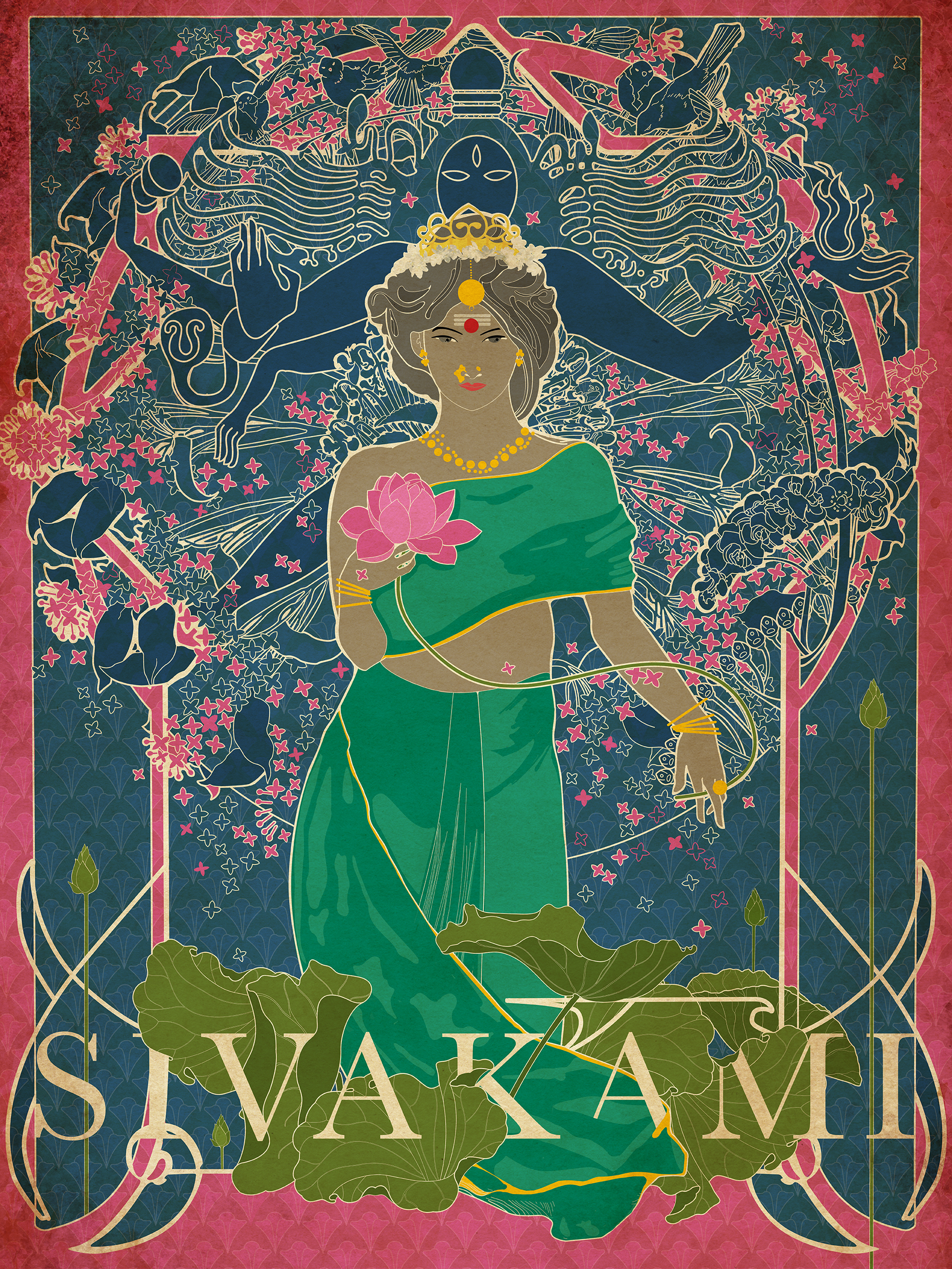 Still wearing her crown, (for she was born a princess), and holding a lotus, an unusually opulent version of Parvati, is here in her most beautiful form – Sivakami, the one Shiva desires. As the wind awakens, she stands calm and still watching her husband begin the Thandav, a dance so powerful it creates and destroys the universe. She is the only one who can draw him, through anger or moaning, through Thandav or Thapas. Shiva, a god capable of great passion, had locked himself away from the world, after losing his first wife Sati. Sivakami through her beauty and her mind made him open his eyes to her, bringing him back into samsara – into life, love and their very unique family.She is nature – Prakriti, returning Purusha from his mind into reality. She is as calm as he is animated - a reversal of roles. The usual business of things holds the male as the passive force of the universe and the female as the active one. As Sivakami and Natraja, Parvati and Shiva, take the other one’s place.
